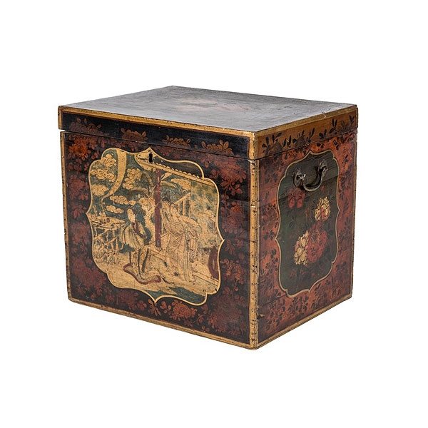 Caja china de madera lacada con decoración de flores y escenas cortesanas en cartelas, trabajo para la exportación a Europa S.XVIII