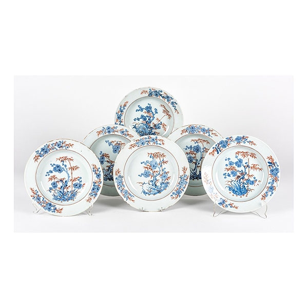 Seis platos hondos de porcelana china de Compañía de Indias con decoración Imari de ramas de bambú y flores en azul, rojo y dorado, pps.S.XIX. Faltas