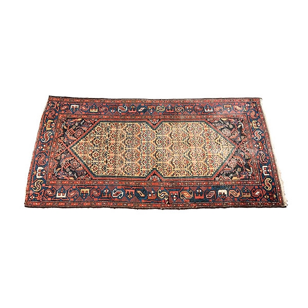 Alfombra de lana del Cáucaso de campo crudo con decoración vegetal estilizada y cenefa de fondo rojo