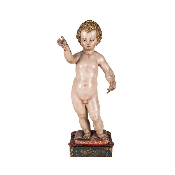 Niño Jesús de madera tallada y policromada, Castilla S.XVII. Descansa sobre almohadón, brazo levantado y pelo dorado. Faltas