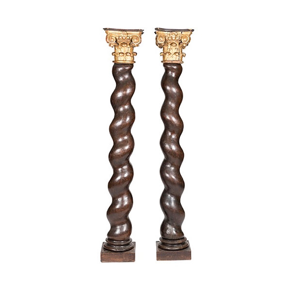 Pareja de columnas salomónicas de madera y capiteles de orden compuesto