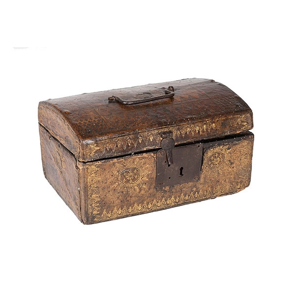 Arqueta francesa cubierta de cuero gofrado con aldava y escudo de cerradura de hierro forjado, S.XVI