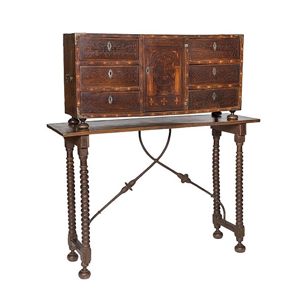 Bargueño de muestra descubierta sobre mesa de madera de nogal con fileteados de boj, trabajo astur-leonés del S.XVII 54 x 29 x 107 cm el bargueño 1.500 - 2.000 €