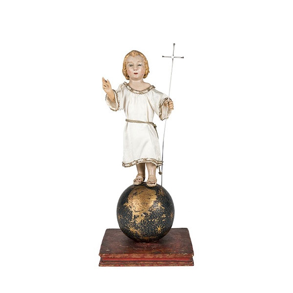 Niño Jesús portugués de madera tallada y policromada sobre orbe S.XVIII. Policromía refrescada