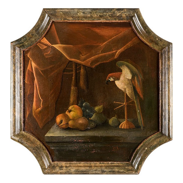 Panel de madera pintado al óleo "Bodegón de frutas y loro" con marco marmolizado siguiendo modelos del S.XVIII