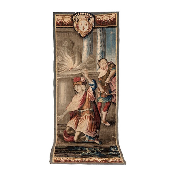 Fragmento de tapiz Aubusson representando a "Aquiles herido" con escudo de armas en la cenefa, SS.XVII-XVIII