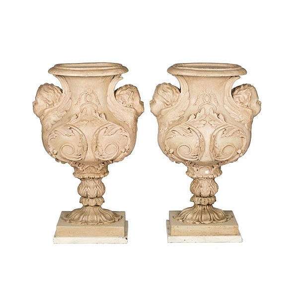 Pareja de pedestales italianos en forma de copa de resina con cabezas de ángeles y hojas de acanto, siguiendo modelos barrocos 99 x 35 x 60 cm 500 - 600 €