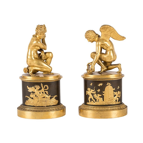 Pareja de figuras de bronce dorado y patinado representando a Venus y Cupido, época Imperio, hacia 1820