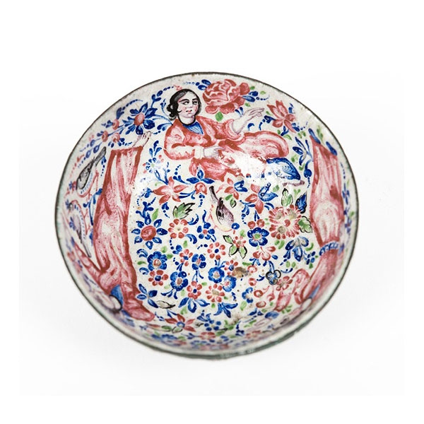 Bol esmaltado con decoración de flores, aves, damas recostadas y tondos con figuras, trabajo Indo persa S.XVIII