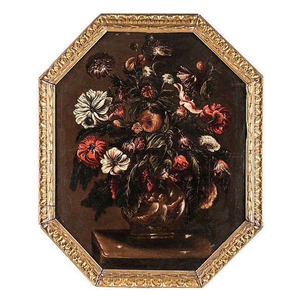 "Bodegones de flores sobre una repisa