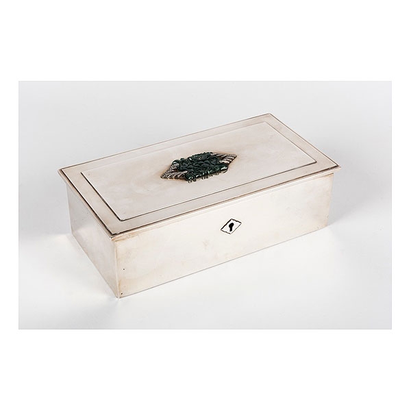 Caja de plata con placa de vidrio verde y strass, Art Decó. Marcas 8 x 14 x 26 cm 1.370,8 grs peso total con estructura interior de madera 1.000 - 1.200 €