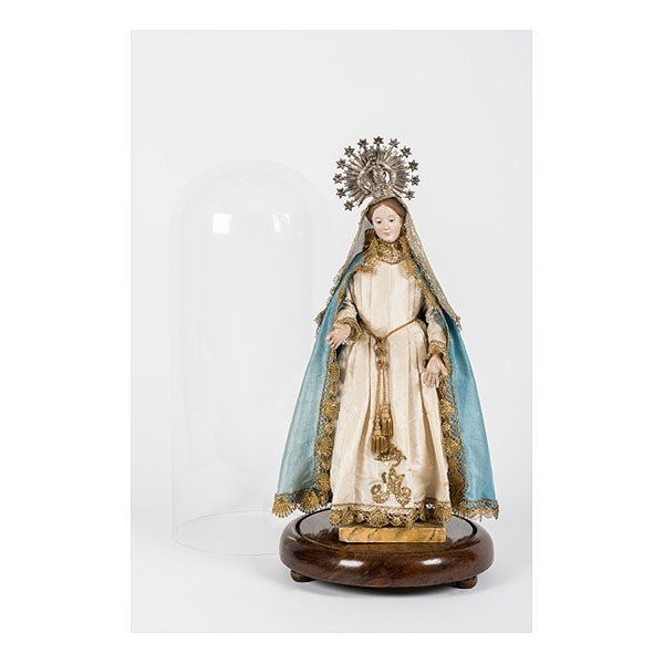 Virgen vestidera de madera policromada con corona de plata en fanal de cristal, trabajo catalán del S.XIX