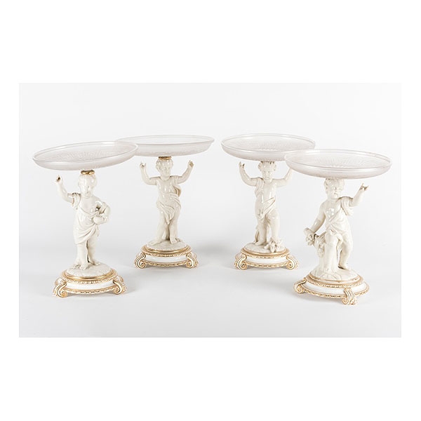 Cuatro centros de mesa de porcelana blanca y dorada con platos de cristal y vástagos en forma de niños alegoría de las cuatro estaciones, Francia S.XIX