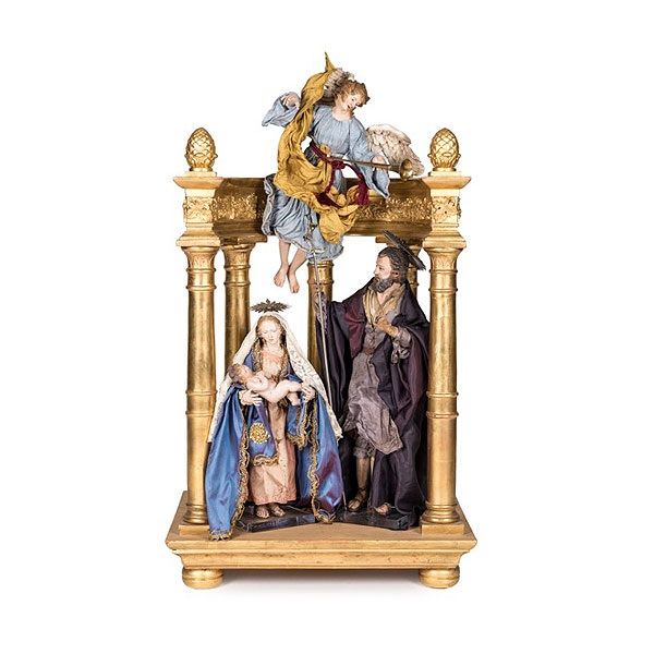 Misterio napolitano de terracota policromada, tejidos de seda y plata en un templete arquitectónico de madera dorada. La Virgen del S.XVIII y san José del S.XIX