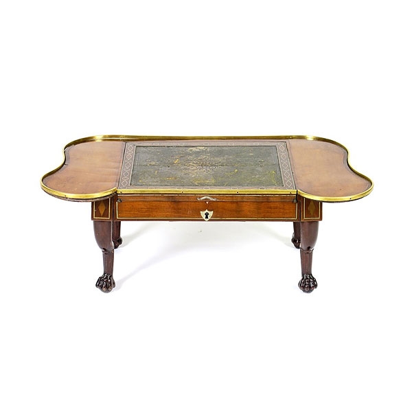 Mesa de cama francesa de caoba con embutidos de zinc y tapa de cuero verde, monturas de bronce dorado. Cerradura firmada "Biennais M. Ebeniste au Singe Violet, rue Honoré, nº 511", hacia 1800