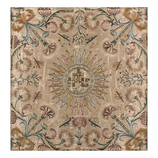 Bordado sobre seda con emblema Jesuita de hilos de oro y motivos de claveles e insectos, Trabajo colonial, S.XVII - XVIII. Faltas y restauraciones