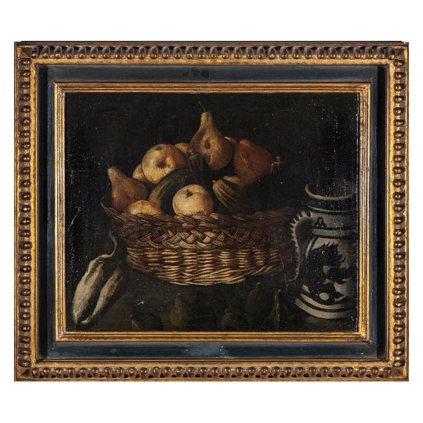 "Bodegón con cesta de frutas y jarra de cerámica"