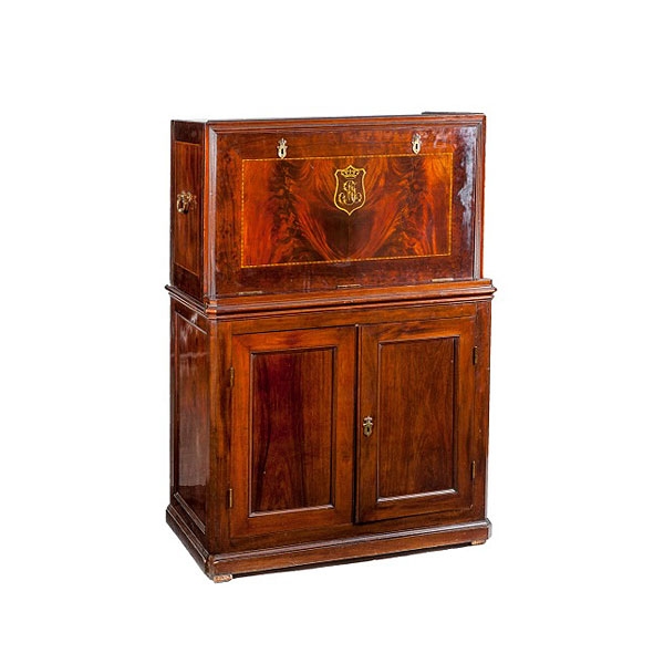 Mueble de dos cuerpos con tapa abatible de caoba y embutidos de latón con las iniciales de Don Juan de Borbón y Doña María coronadas, pps.S.XX