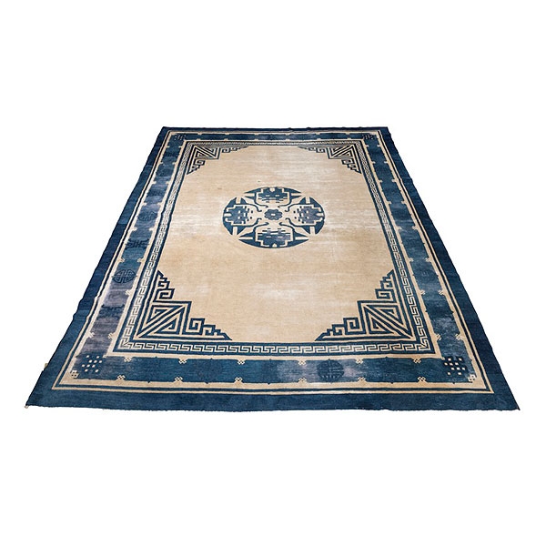 Alfombra china Pekín de fondo azul y beige con medallón central.