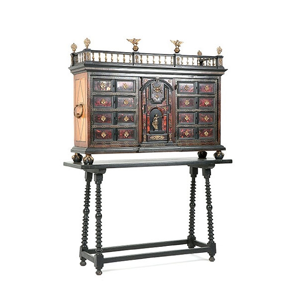 Bargueño sobre mesa con decoración de carey, molduras ebonizadas y aplicaciones de bronce, época Carlos II, ffs.S.XVII