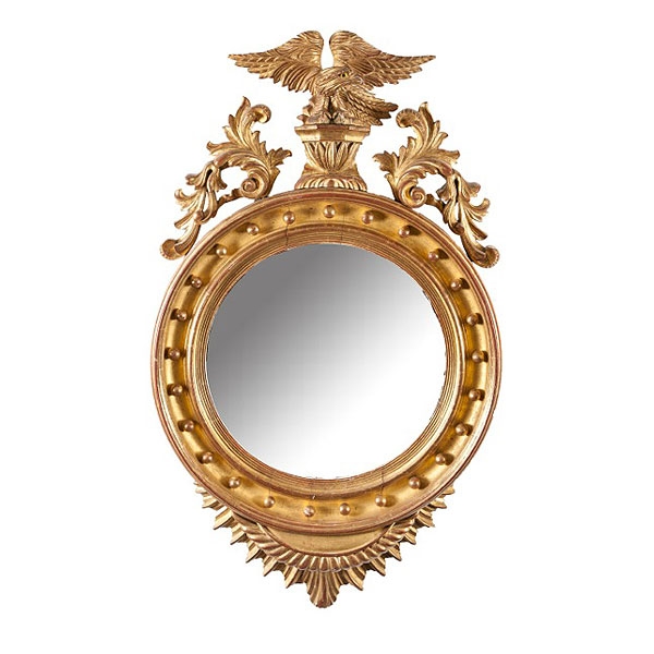 Espejo circular de madera tallada y dorada rematado por águila, estilo Regency