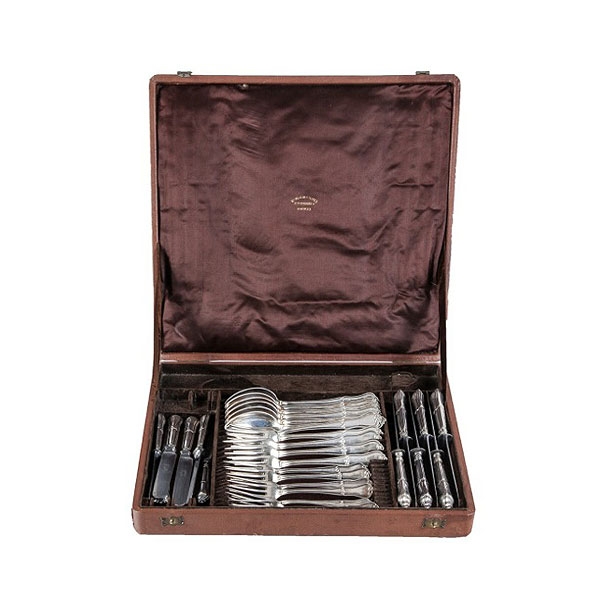 Juego de seis servicios de mesa modelo "nudo" con cuchillos tenedores, cucharas , tenedores de merienda y cuchillos de merienda, Marcas de Madrid Villa y corte y de platero Lobon, S.XIX. En su estuche.