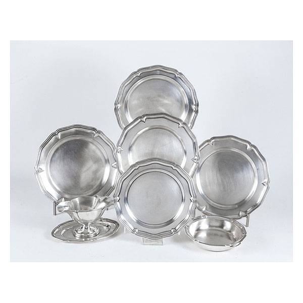 Juego de servir de plata con el borde ingletado compuesto por ocho fuentes ovales, cinco fuentes circulares, un bol y una salsera