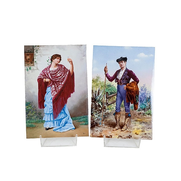 Pareja de placas de loza pintada de la fábrica de Pickman en Sevilla "Sevillano en traje corto" "Sevillana con mantón" firmadas M. Rodríguez y fechadas en 1890.