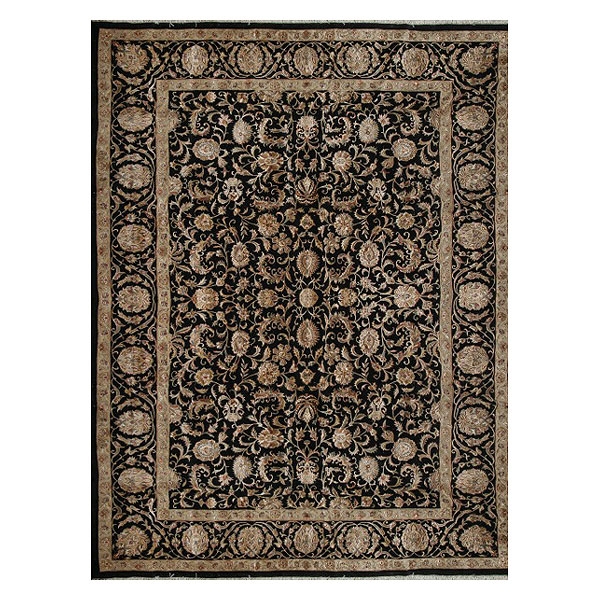 Alfombra persa Hereke de lana con fondo color negro y diseño vegetal estilizado