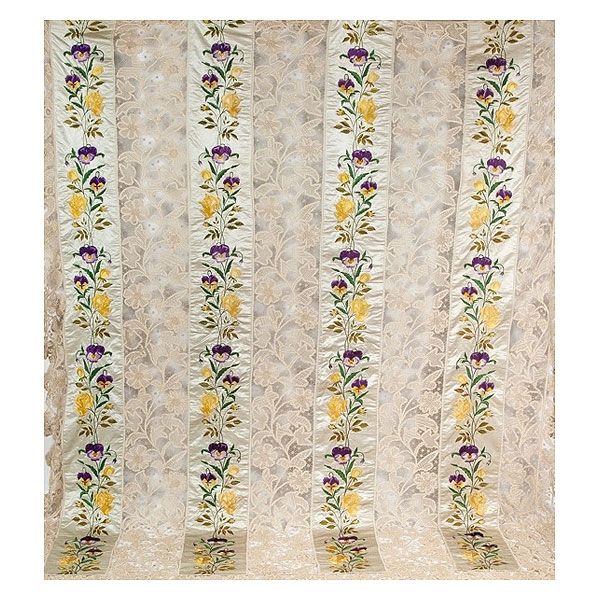 Colcha de seda bordada con pensamientos y encaje de bolillos ffs.S.XIX