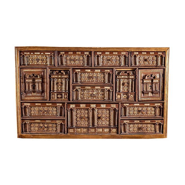 Bargueño de nogal con frente tallado, dorado y con embutidos y columnillas de hueso sobre mesa de nogal torneada, Castilla med. S.XVII