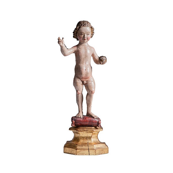 Niño Jusús de madera tallada y policromada sobre peana dorada, trabajo de Malinas de la primera mitad del S.XVI.