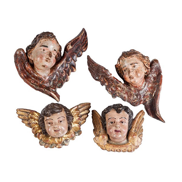 Cuatro cabezas de ángeles de madera tallada y policromada S.XVIII