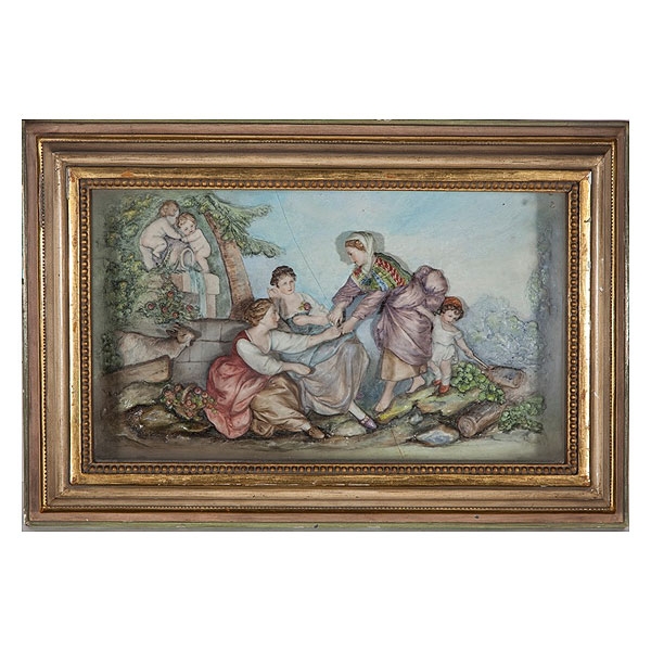 Dos relieves de porcelana cfrancesa con escenas pastoriles y marcos lacados y dorados de gusto neoclásico, S. XIX