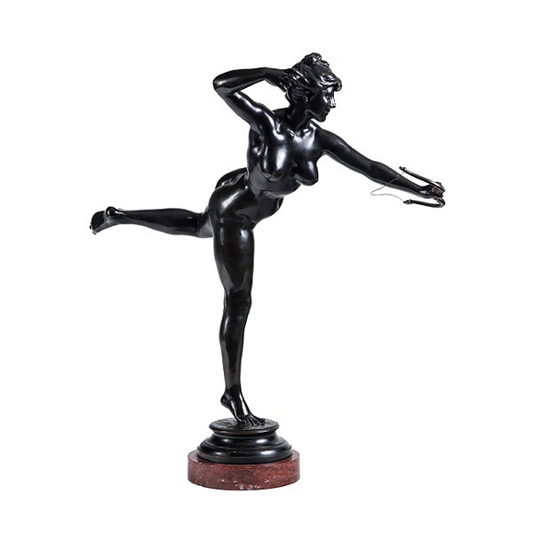 Jean Alexandre Falguiere (1831 - 1900) "Diana cazadora" bronce patinado sobre base de mármol rojo.