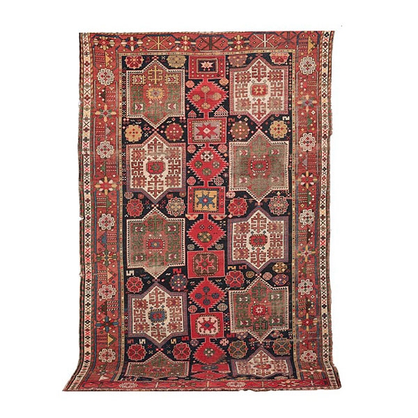 Alfombra persa del Cáucaso con decoración geométrica en azules y rojos. Areas de desgaste