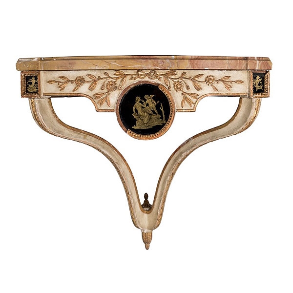 Consola de colgar de madera tallada policromada en blanco y dorada con vidrio eglomisé y tapa de mármol, trabajo español de estilo Carlos IV