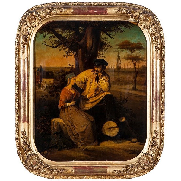 Grabado bajo cristal "Pareja" con marco dorado, S.XIX