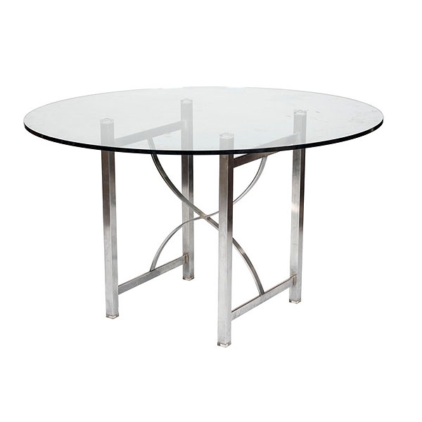 Mesa circular con pie de acero y tapa de cristal con cuatro sillas de acero y tejido vegetal, años 80