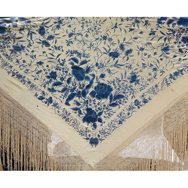 Mantón de Manila de seda bordada color beige con peonías y flores azules.