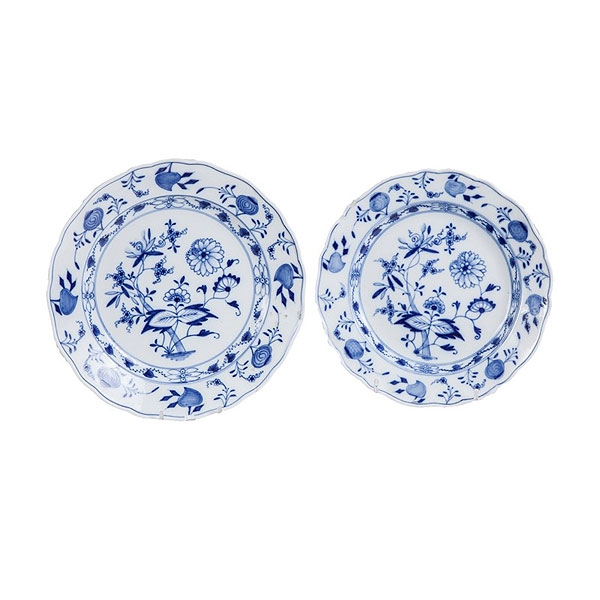 Dos platos de porcelana de Meissen azul y blanco, Modelo "Onion".