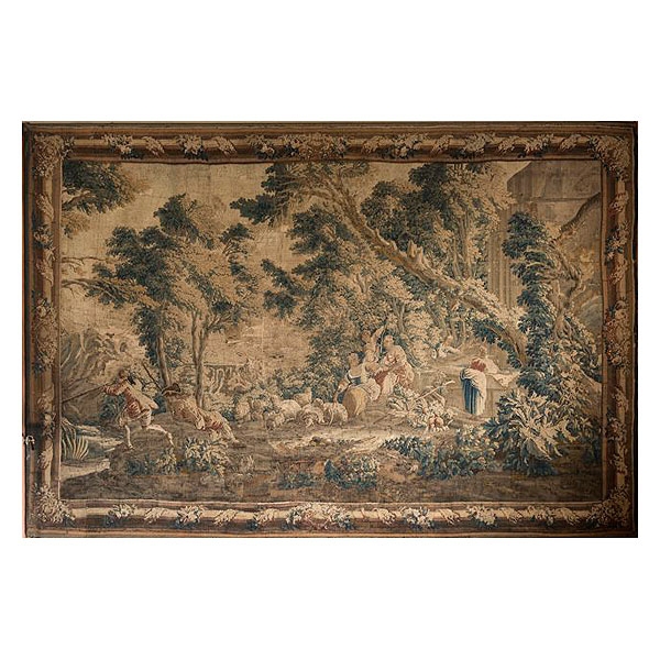 Tapiz francés de lana y seda de la manufactura de Aubusson "Pastores y cazadores en un paisaje", S.XVIII. Faltas