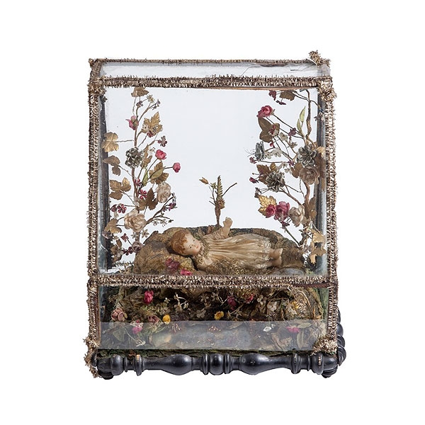 Niño Jesús de cera en urna de cristal, trabajo conventual italiano del S.XVIII