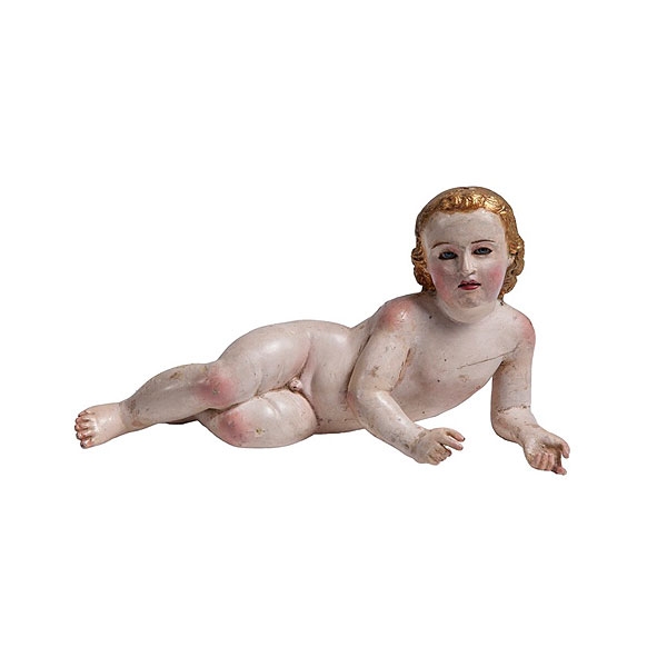 Niño Jesús recostado de madera tallada y policromada con pelo dorado, taller quiteño S.XVIII