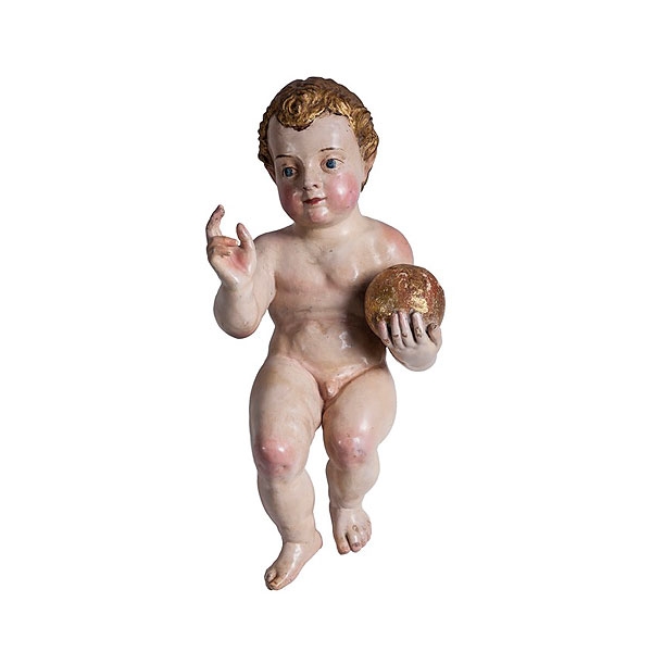 Niño Jesús sentado de madera tallada y policromada con pelo dorado, taller quiteño ffs. S.XVIII