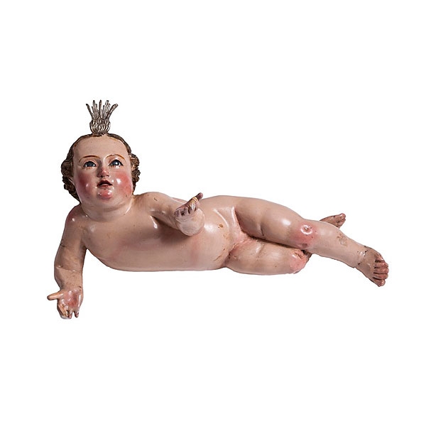 Niño Jesús recostado de madera tallada y policromada, trabajo Quiteño pps.S.XIX