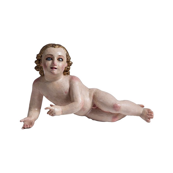 Niño Jesús recostado de madera tallada, policromada y dorada, trabajo Quiteño S.XVIII