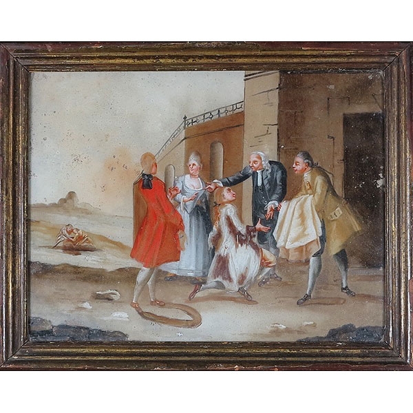 Cinco vidrios pintados por el reverso franceses “Regreso del hijo pródigo” S.XVIII.