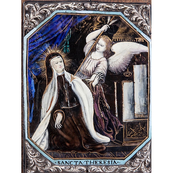 Placa de esmalte de Limoges "Santa Teresa" firmada por el reverso P.Moualher, ffs.S.XVII