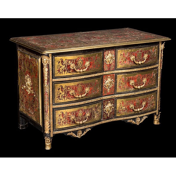Cómoda francesa de marquetería de latón y carey teñido de rojo Boulle con monturas de bronce dorado, época Luis XIV hacia 1714. Faltas